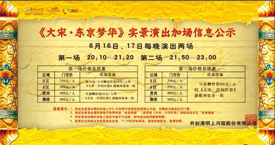 第一場(chǎng):購(gòu)《大宋·東京夢(mèng)華》A區(qū)、B區(qū)票的游客加30元即可獲贈(zèng)價(jià)值60元/人的《大宋·汴河燈影》游船體驗(yàn)券一張;購(gòu)《大宋·東京夢(mèng)華》貴賓票和御座的游客可免費(fèi)獲贈(zèng)價(jià)值60元/人的《大宋·汴河燈影》游船體驗(yàn)券一張。