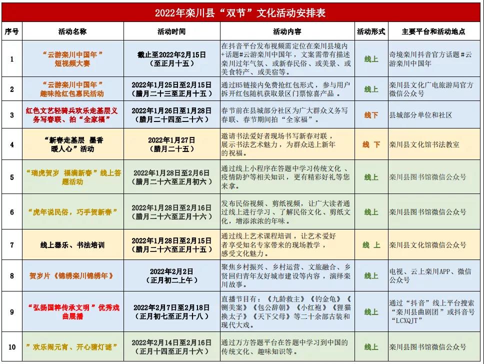 欒川縣根據(jù)當前疫情防控要求,落實就地過年各項舉措,做好疫情防控阻擊戰(zhàn)的同時,全力營造喜氣洋洋的節(jié)日氛圍,豐富全縣人民精神文化生活,進一步傳承發(fā)展優(yōu)秀傳統(tǒng)文化,讓全縣人民過心安年。今日起,欒川縣群眾文化活動將持續(xù)為您送上!