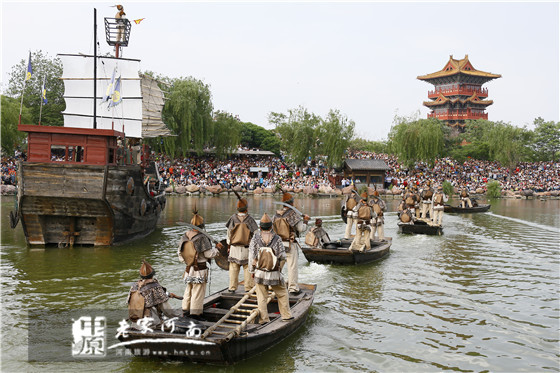 大型歷史故事《包公巡視汴河漕運(yùn)》,每天9:25,在虹橋兩側(cè)水面準(zhǔn)時(shí)上演。