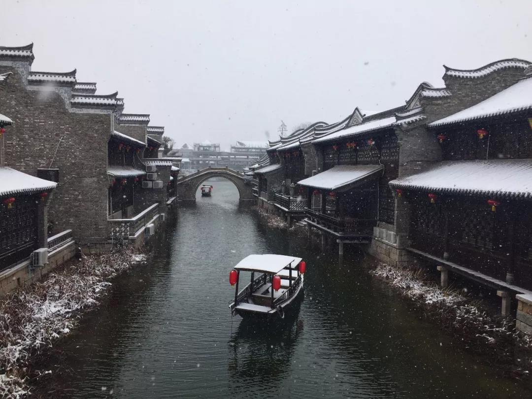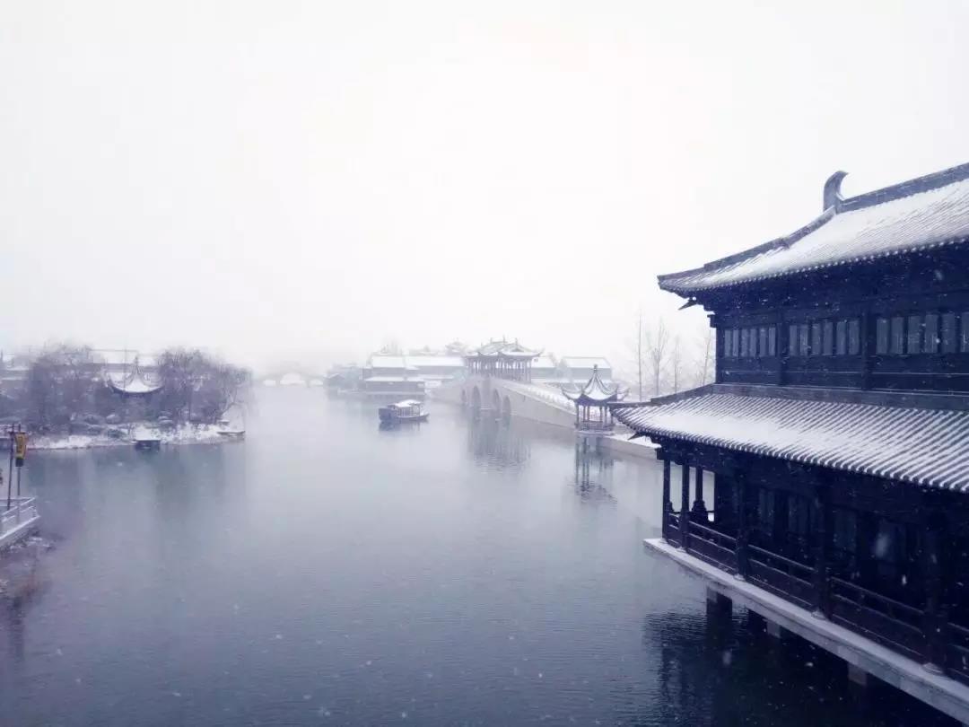聚仙湖、狀元橋、湖心島、啟封客棧等一座座建筑在這一派朦朧的雪白世界里顯得格外出塵脫俗,回歸嫻靜恬淡的本色。