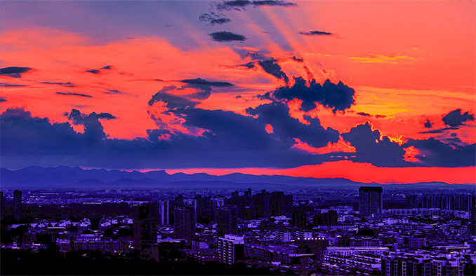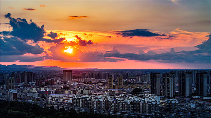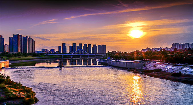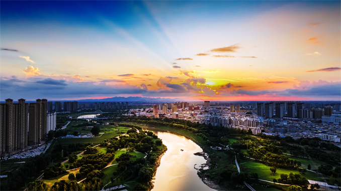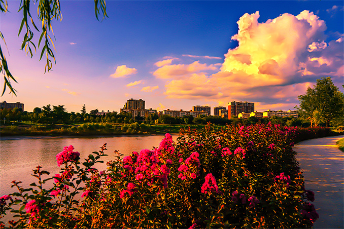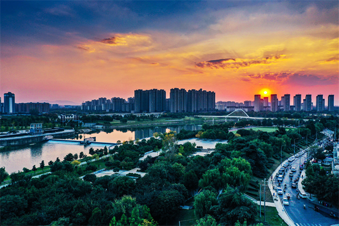 盛夏時(shí)節(jié),駐馬店市遂平縣城南新區(qū)夕陽(yáng)西下,滿(mǎn)天彩霞把天空渲染得瑰麗多彩,蜿蜒的汝河在晚霞映照下顯得寂靜柔美。城市與晚霞相互映襯,繪就出一幅唯美夢(mèng)幻的畫(huà)卷。