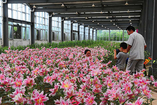 綠博園的百合花展中眾多系列的百合各具特色,有的色彩豐富、明艷動(dòng)人,有的百合則清甜芳香、香氣濃郁。一條條由淺黃、淡粉、雪白、淡紫等各色百合花匯成的美麗花海,讓人迷醉在濃濃的愛意之中久久徘徊,或拍照留念或細(xì)細(xì)觀賞,不舍離去。溫室內(nèi)裝點(diǎn)的心形拱門,向游客傳遞著濃情蜜意和對美好生活的祝福。