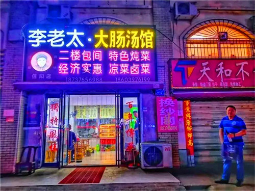 信陽羅山縣城行政中路,溝通新區(qū)和老城的要道,每天人流車輛熙攘往來,川流不息。在這條街靠近東口的位置,就是羅山名吃“李老太大腸湯館”。在首屆全球文旅創(chuàng)作者大會期間,因?yàn)榫W(wǎng)友的拍攝,“李老太大腸湯館”被越來越多外地人知曉,成為外地人紛紛前往的熱門美食打卡地。