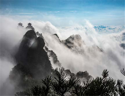 站在金頂?shù)臋跅U旁,不斷地呼吸著清新的空氣,肺好似被水霧濾過一般舒服。周圍的云很低,似乎你一伸手,便可以采擷你想要的那一朵。眺望群山,藍(lán)天之下,云海之中,令人心里頓生一份清遠(yuǎn)和空靈。仿佛大千世界,萬物幻滅,都容納在其間。這世間,再?zèng)]有一種高度可以將其超越,再?zèng)]有一種襟懷可以將其企及。