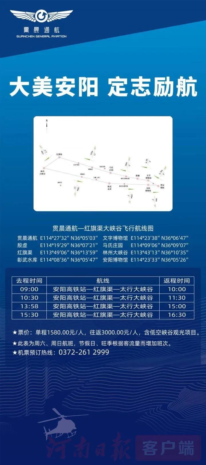 這條直升機(jī)航線的開通后,縮短了安陽到林州太行大峽谷的空間距離。首飛航線為:貫晨通航安陽基地→文字博物館→殷墟→馬氏莊園→紅旗渠展覽館→太行大峽谷,全程約70公里,計(jì)劃飛行時(shí)長90分鐘(往返)。