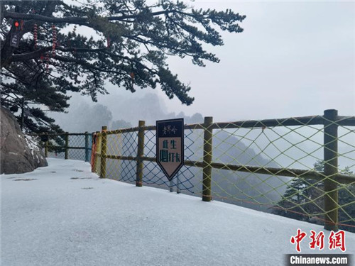 雪花紛紛揚(yáng)揚(yáng)飄灑在山峰、樹木、步道上,轉(zhuǎn)瞬間就銀裝素裹。遠(yuǎn)處云霧縹緲,古松奇峰聳立其間,與雪花共同構(gòu)成了一幅水墨畫卷。