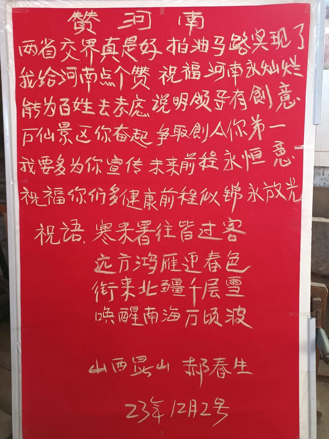 “兩省交界真是好,柏油馬路實(shí)現(xiàn)了,我給河南點(diǎn)個(gè)贊,祝福河南永燦爛……”為感謝萬仙山景區(qū)打通這條柏油路,讓昆山群眾告別“水泥路”,該村村民還精心編寫了順口溜表達(dá)對萬仙山景區(qū)、對河南的誠摯謝意。