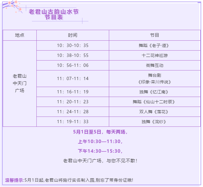 今年豪華版五一連休五天,蠢蠢欲動了有沒有?別猶豫,出發(fā)吧!向著春日的老君山!十二花神巡游,精彩舞臺劇,浪漫古風(fēng)歌舞,網(wǎng)紅打卡點……5月1日至5月5日,老君山古韻山水節(jié)等你!