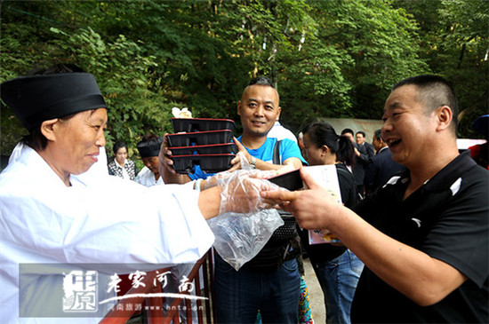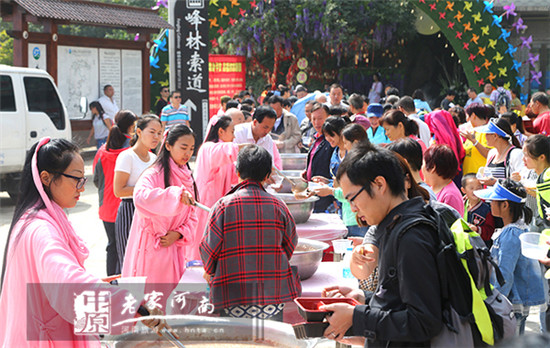 9月16日,中秋節(jié)小長假第二天,道教圣地河南老君山景區(qū)中天門廣場。來自全國各地,前來老君山辟谷仙修的眾弟子正將經(jīng)過誦經(jīng)加持“能量”的八寶粥免費發(fā)放給游客。