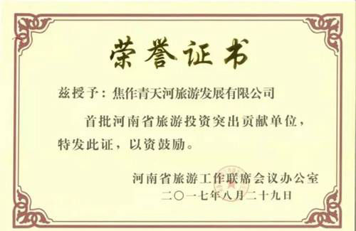 近日,河南省旅游業(yè)轉(zhuǎn)型發(fā)展工作會議在鄭州召開。會上,河南省旅游局局長寇武江宣讀了首批旅游投資突出貢獻(xiàn)單位表彰通報(bào),焦作青天河旅游發(fā)展有限公司榮獲“首批河南省旅游投資突出貢獻(xiàn)單位”榮譽(yù)稱號。