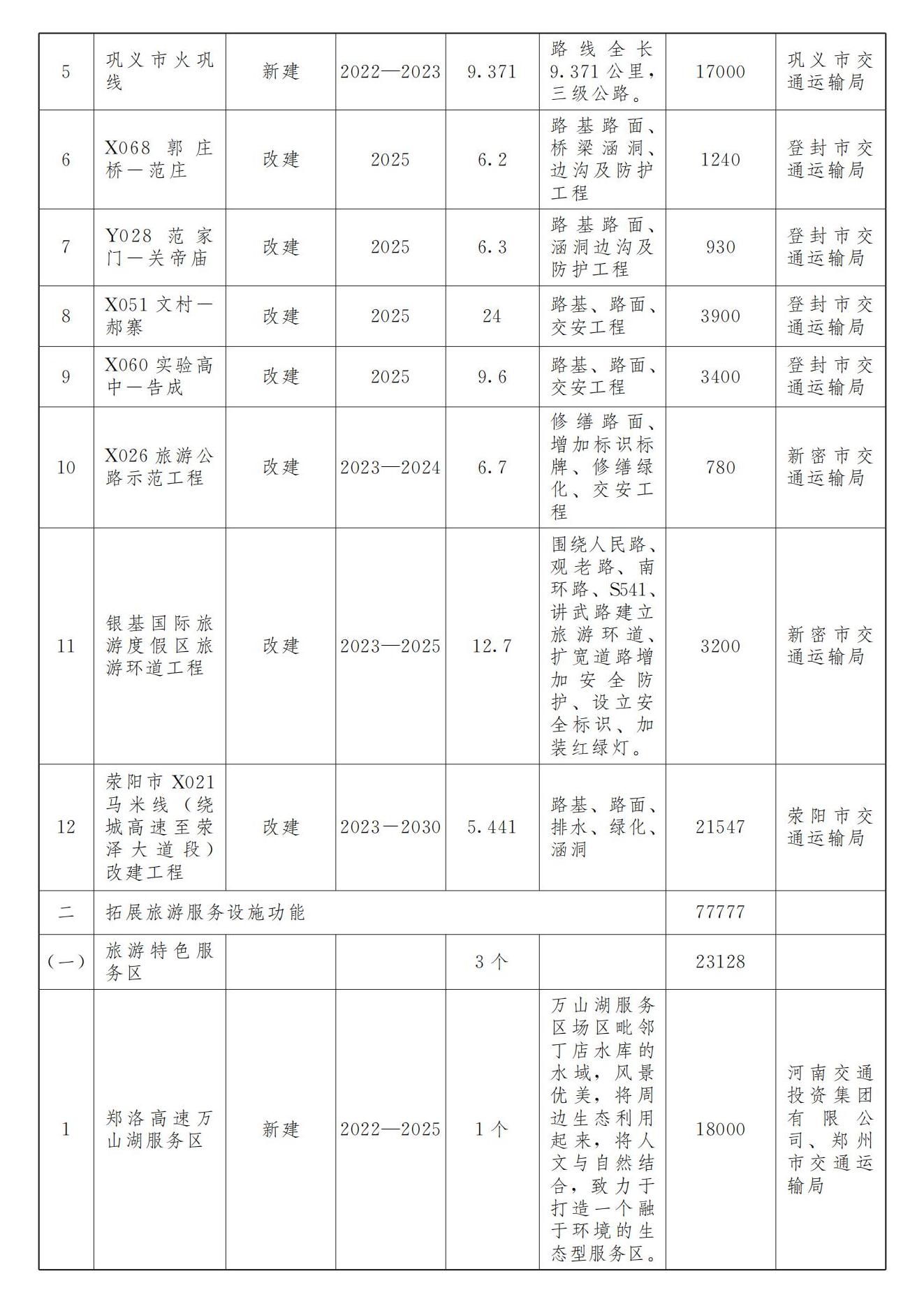 1.推動“服務區(qū)+”發(fā)展。依托區(qū)域特色,以新建鄭洛高速萬山湖服務區(qū)、已運營的鄭少高速少林服務區(qū)和S312惠濟服務區(qū)等為載體,全力推進具有地方濃厚文化底蘊的主題特色服務區(qū)建設,實現(xiàn)服務區(qū)與特色農產品、民族文化、紅色文化、綠美生態(tài)的有機融合,打造一批集休閑、旅游、購物、娛樂等功能為一體的綜合旅游服務區(qū)。到2025年,打造旅游特色服務區(qū)3個以上。