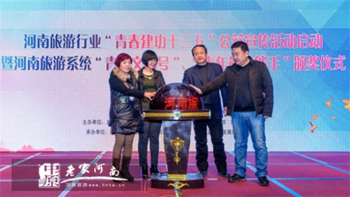 河南省旅游局黨委專職副書記潘進軍、共青團河南省委副部長李山英、鳳凰網(wǎng)河南旅游頻道總監(jiān)郭穎穎、天瑞集團旅游發(fā)展股份有限公司副總經(jīng)理呂勁松共同啟動水晶球,標(biāo)志著“河南旅游行業(yè)‘青春建功“十三五”公益宣傳展示活動正式啟動。
