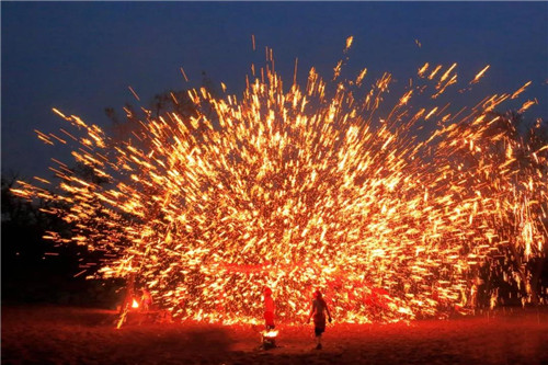 打鐵花時(shí),先把熔好的1600攝氏度的鐵汁注入事先準(zhǔn)備好的“花棒”,打花者一手拿著盛有鐵汁的“花棒”,用下棒猛擊盛有鐵汁的上棒,打花者一棒接一棒,一人跟一人,打鐵花藝人光著膀子在火海中穿行,五彩繽紛、震天動(dòng)地,宛若鎏金花海!