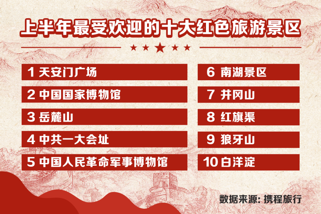 6月23日,攜程發(fā)布的《2021上半年紅色旅游大數(shù)據(jù)報(bào)告》顯示,上半年國內(nèi)紅色旅游景區(qū)預(yù)訂量同比增長超2倍。其中,河南紅色游成了突出的亮點(diǎn),安陽上榜最具人氣的紅色旅游目的地TOP10,一同上榜的有北京、南京、上海、長沙、延安、嘉興、遵義、韶山、南昌。另外,紅旗渠景區(qū)與天安門廣場、中國國家博物館、岳麓山、中共一大會(huì)址、中國人民革命軍事博物館、南湖景區(qū)、井岡山、狼牙山和白洋淀等,一起上榜了上半年最受歡迎的十大紅色旅游景區(qū)。