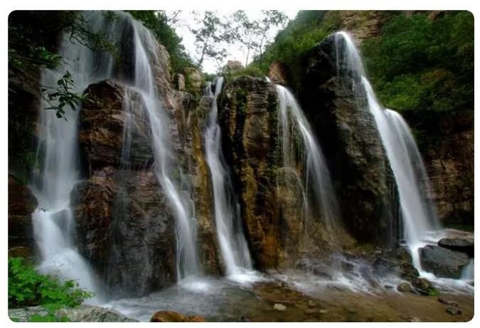 九里溝瀑布眾多,其中以九龍飛瀑和石槽瀑布最為壯觀。豐雨期的九龍飛瀑,數(shù)股激流從斷崖絕壁傾瀉而下,霧氣升騰,聲震山谷。石槽瀑布的如流似瀑,清澈的溪水在數(shù)百米長的石谷中連跳七級,年深日久,將河床沖刷成S型。