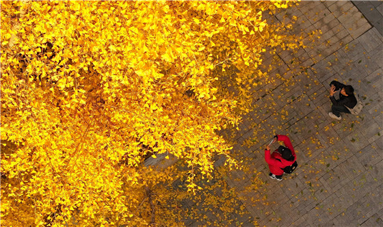 金黃的銀杏葉和旁邊的紅墻交相輝映 鄭報全媒體記者 馬健 攝