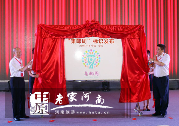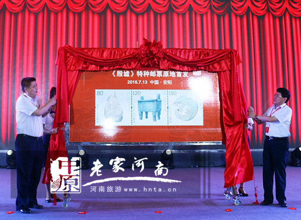 中國(guó)郵政集團(tuán)公司郵票發(fā)行部總經(jīng)理高山、安陽市政府常務(wù)副市長(zhǎng)陳志偉共同為《殷墟》特種郵票揭幕