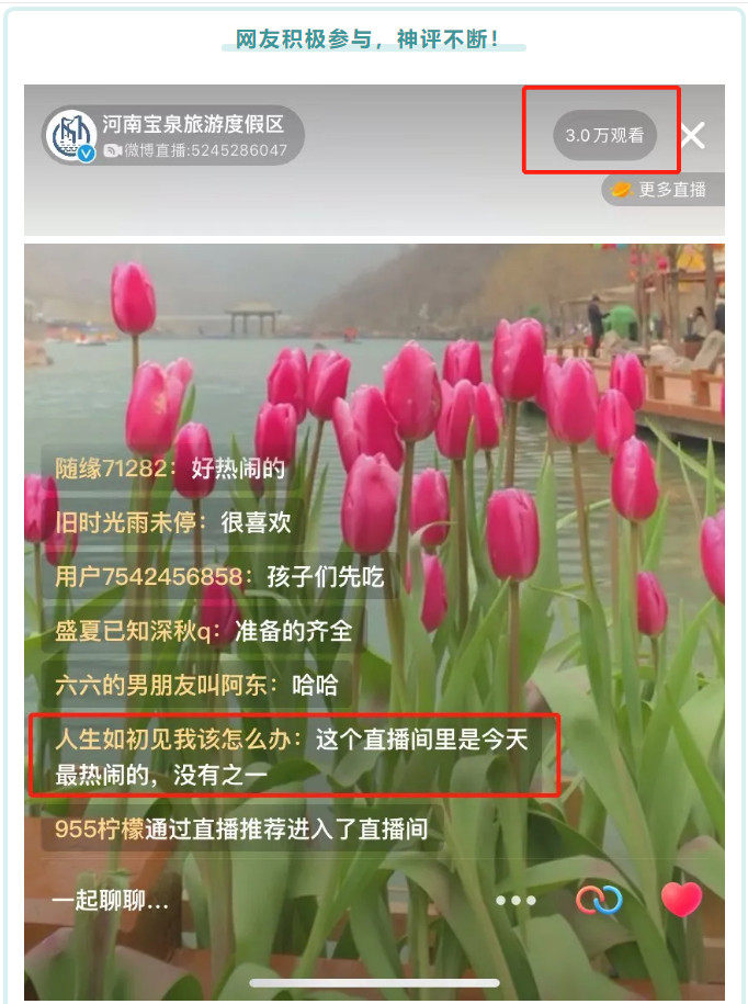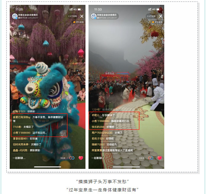 當日上午10:30“直播中國年-云游寶泉”正式開啟,通過線上直播帶大家感受“寶泉新春游園會”的火熱現(xiàn)場!直播期間,在線人數(shù)高達3萬余人,互動評論數(shù)超千條,點贊量破萬;線下過萬游客親臨活動現(xiàn)場,感受濃濃年味。