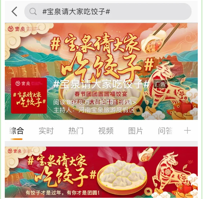 云游合家歡,就地過大年。寶泉景區(qū)與時俱進,在全國率先開啟云過年。#寶泉請大家吃餃子#話題一經微博上線推出,立刻受到了全網(wǎng)廣泛關注,引發(fā)網(wǎng)友紛紛參與轉發(fā),截止目前,話題閱讀量達到了735.8萬人次,登上微博熱搜榜第三名。