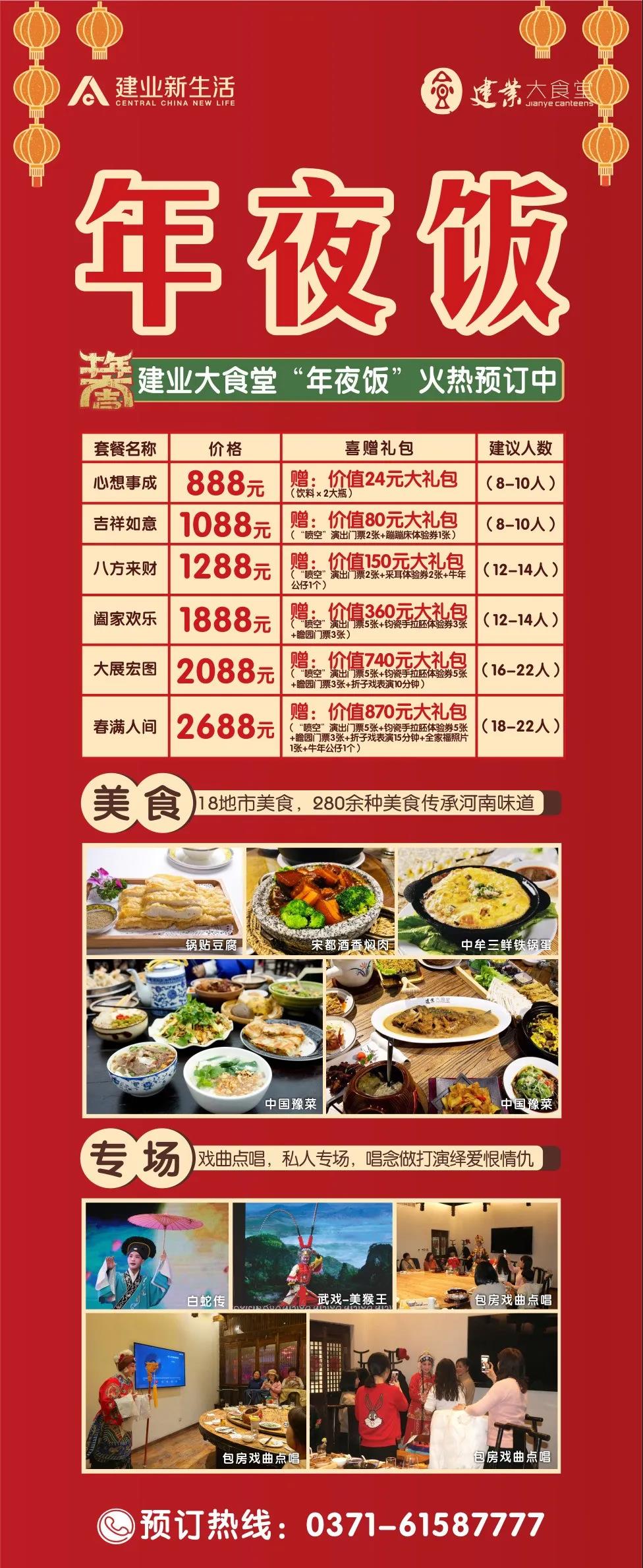 匯集18地市、280余種美食的“吃貨天堂”—— 建業(yè)大食堂,推出“預(yù)定團圓年夜飯贈禮包”優(yōu)惠活動。另外,還有戲曲演唱、私人專場唱念做打演繹愛恨情仇。