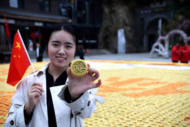 9月30日,中秋國慶雙雙來臨,河南洛陽老君山廣場,工作人員用近萬枚月餅拼成一個(gè)直徑達(dá)8米的超大月餅,這個(gè)特殊的超大月餅上有大家現(xiàn)場制拼出的“我愛你中國”字樣和一輪明月圖案。大家手持小紅旗,圍著月餅,隨著愛國歌曲“我愛你中國”、《我和我的祖國》音樂聲的響起,現(xiàn)場的氣氛也達(dá)到了高潮。游客和工作人員高舉小國旗,跟隨著音樂旋律一起舞動(dòng)、一起歌唱,抒發(fā)著對(duì)祖國的熱愛和美好生活的向往。