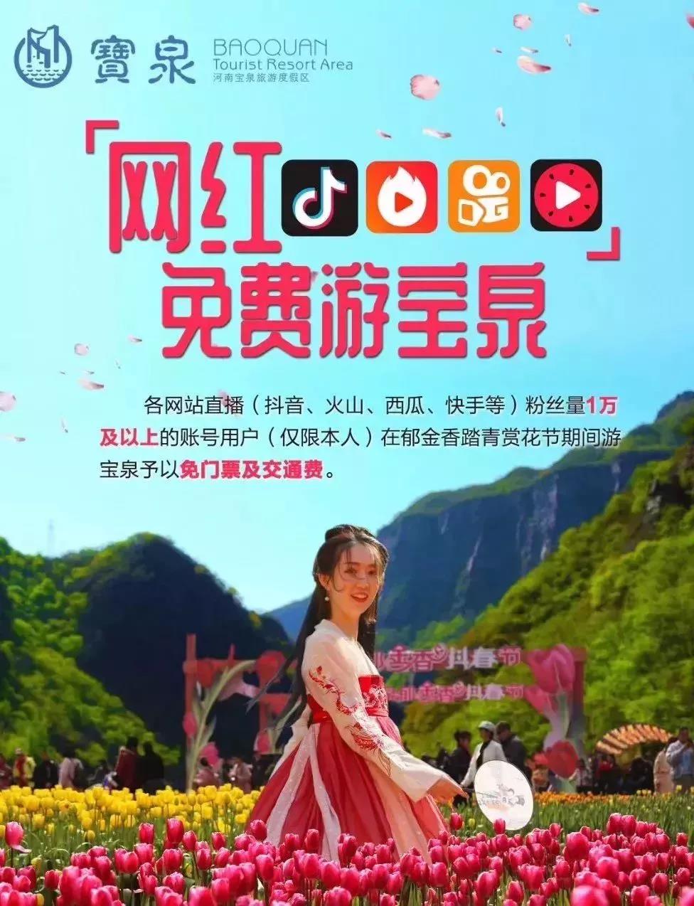 任意短視頻平臺,粉絲量一萬及以上的賬號用戶(僅限本人)在郁金香踏青賞花節(jié)期間將免費游寶泉。