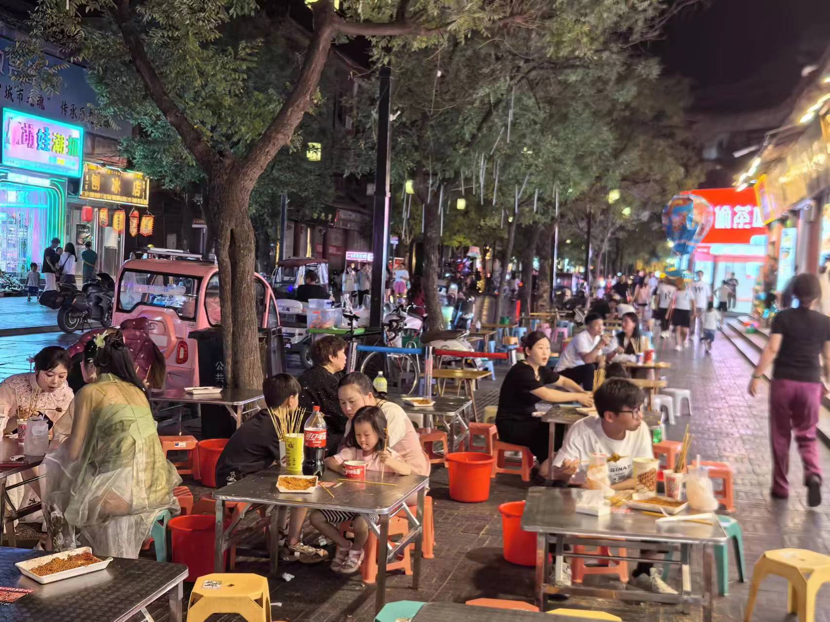 古城歸德市集內(nèi),一排排整齊劃一的鐵板魷魚、秘制冰粉、手工檸檬茶、燒烤大排檔……市集對(duì)面則是“熱辣滾燙”的火鍋,鍋底食材翻滾涌動(dòng),香氣誘人。細(xì)細(xì)感受,商家的吆喝聲、游客的嬉鬧聲,食客的歡笑聲伴隨著掃碼付款的滴滴聲,如同一曲夜間撫慰人心的交響樂,帶著濃濃的煙火氣撲面而來。