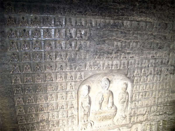千佛洞位于真谷寺摩崖石刻的中間部分,根據(jù)洞口左側(cè)巖石上的一方隸書題記記載,該洞窟應(yīng)建造于隋開皇年間。根據(jù)現(xiàn)有的佛龕和殘留痕跡計(jì)算,四壁共雕刻小佛龕1251尊。洞內(nèi)沿壁腳一周,雕刻了25尊傳法弟子立像,佛龕和傳法弟子像的旁邊都刻有佛名,這在我國(guó)佛窟造像中極為少見,具有很高的價(jià)值,為我們研究中原地區(qū)石窟造像藝術(shù)提供了珍貴的實(shí)物資料,千佛洞的名字也由此而來(lái)。