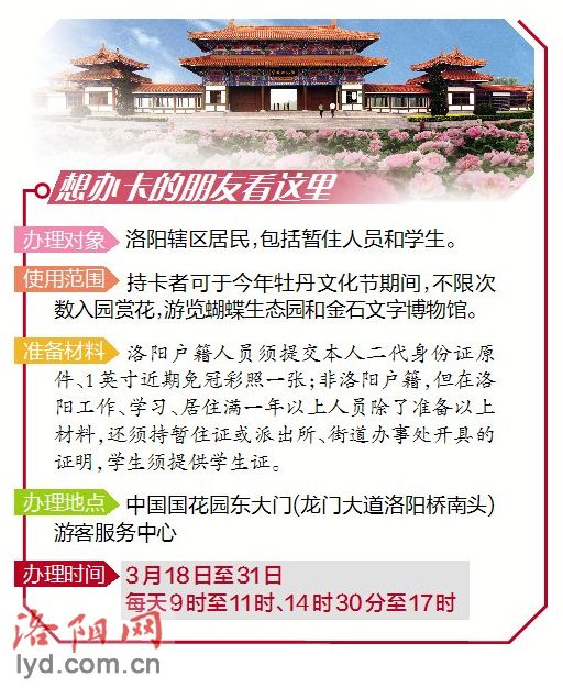 今年中國(guó)國(guó)花園對(duì)洛陽(yáng)市民推出月票卡,辦理費(fèi)用每張30元,持卡者可于今年牡丹文化節(jié)期間不限次數(shù)入園賞花,免費(fèi)游賞蝴蝶生態(tài)園、金石文字博物展。
