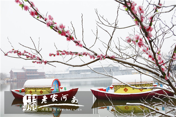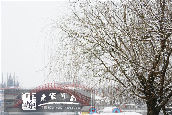 虹橋在美麗雪景的映襯下,更顯得熠熠生輝,一抹亮麗的紅色為美麗的雪景增添了一道別樣的色彩。萬樹江邊杏,新開一夜風(fēng);汴河中清澈的水和潔白的雪相伴相依;上善門別致典雅、雙殿壯麗巍峨……清明上河園儼然成了一幅瑰瑋大氣、民俗韻味十足的水墨畫。