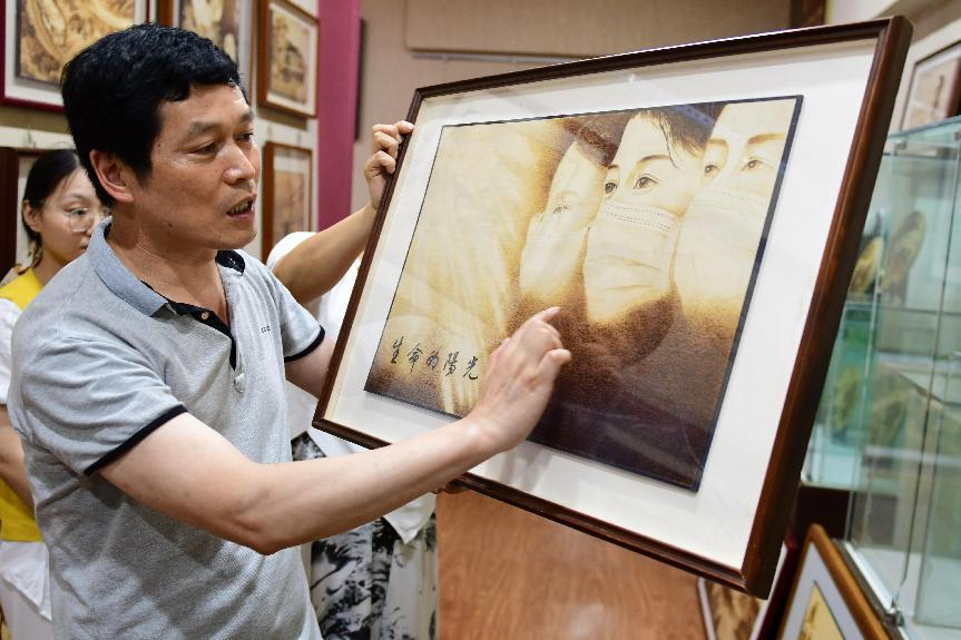 烙畫師傅介紹烙畫作品。陳輝 攝