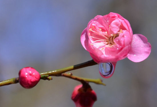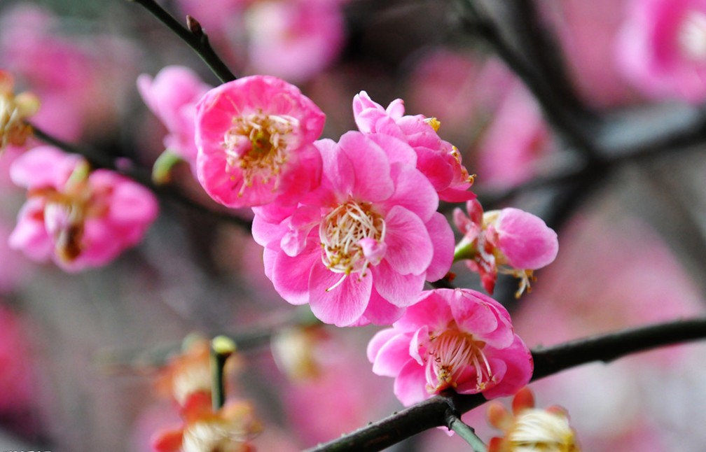植物園里最多的是黃色的梅花,它開花總在冬天,時與雪花相伴,美稱“冬梅、雪梅”。它先開花后長葉,人常稱它為“干枝梅”。它花開時不全張開,張口向下,似金鐘吊掛,也有人叫它“金鐘梅”。
