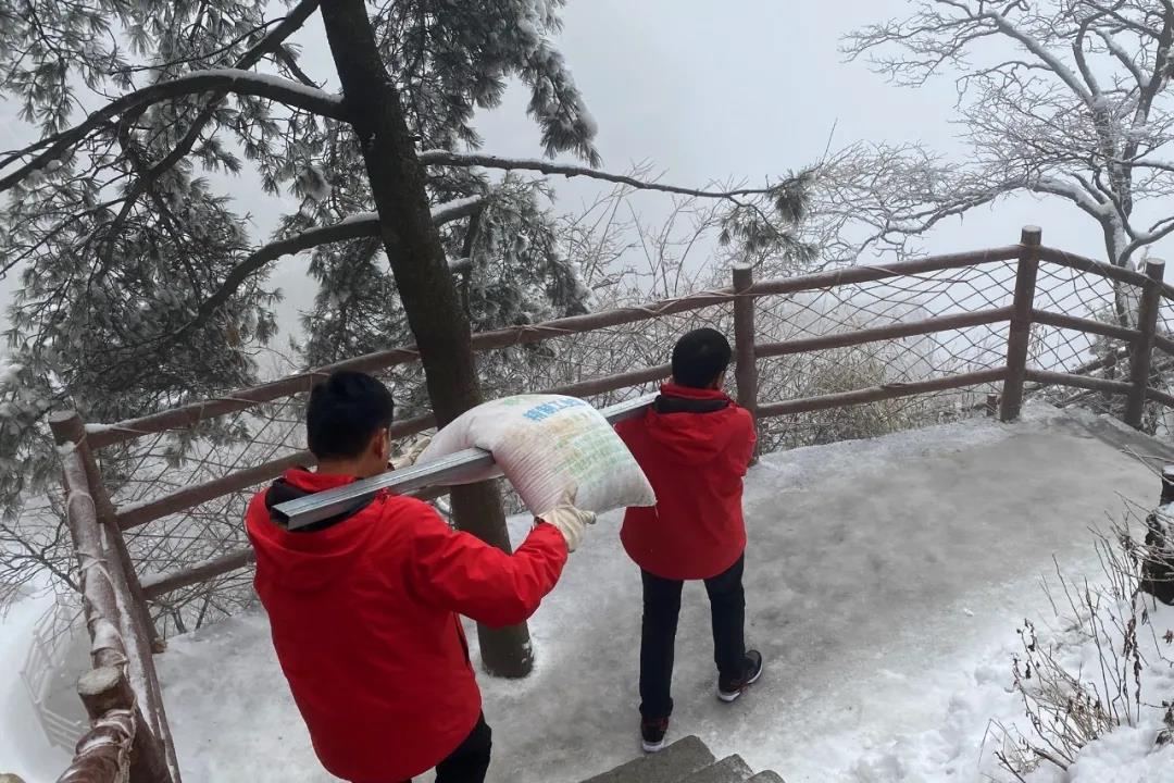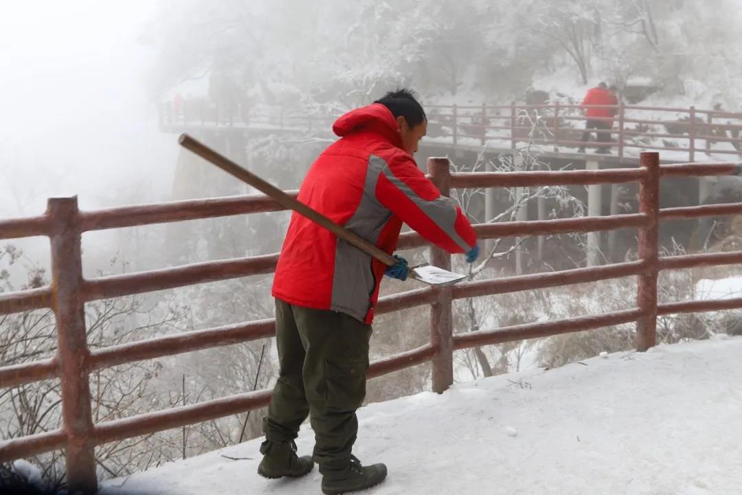在寒冷的環(huán)境中,大家團結協(xié)作,不畏嚴寒,有序的清理道路積雪,各種清掃工具輪番上陣,掃的掃、鏟的鏟、堆得堆,并將工業(yè)鹽背上山頂在重要路段鋪灑,干得熱火朝天,經過一天的努力奮戰(zhàn),主要道路和重點路段積雪被清理干凈,有效保證了游客的游覽安全。