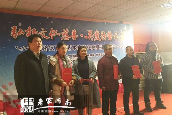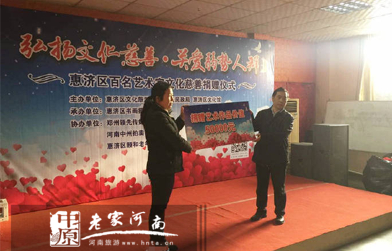 今天下午,由惠濟(jì)區(qū)文化旅游局、惠濟(jì)區(qū)民政局、惠濟(jì)區(qū)文化館主辦,惠濟(jì)區(qū)書畫攝影家協(xié)會(huì)協(xié)辦的“弘揚(yáng)文化慈善,關(guān)愛(ài)弱勢(shì)人群”惠濟(jì)區(qū)百名藝術(shù)家文化慈善捐贈(zèng)儀式在惠濟(jì)區(qū)頤和老年公寓舉行。