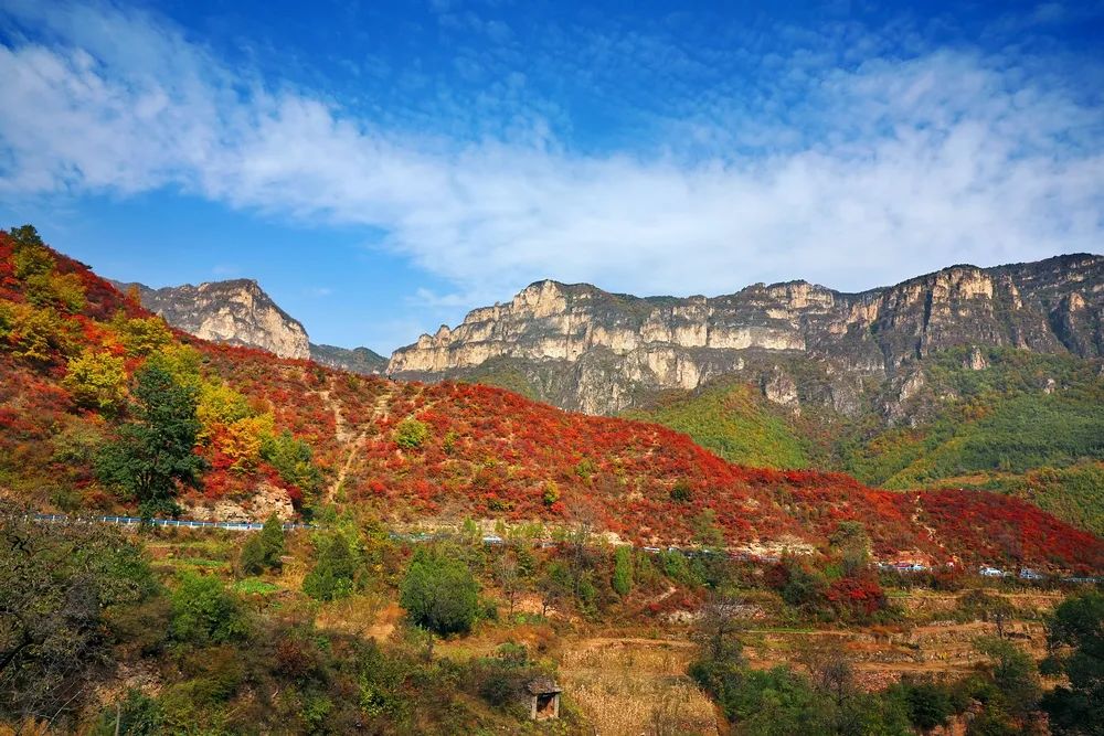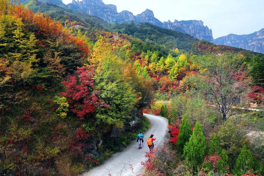 走進(jìn)林州,如同走進(jìn)了紅色的海洋,秋林盡染,紅葉爛漫,在山野中盡情綻放,無論是峽谷峭壁上掛紅搖曳的奇景,勝過畫家手中的調(diào)色板;蚧鸺t、或金黃、或濃綠等各種顏色的葉子和雜草染成斑斕色彩,一片綴連著一片,一株綴連著一株,形態(tài)萬千,千姿百態(tài)。