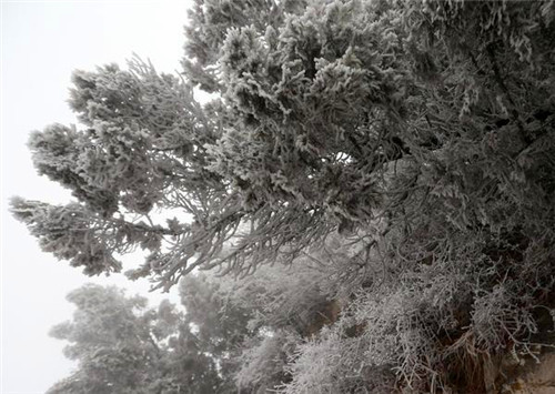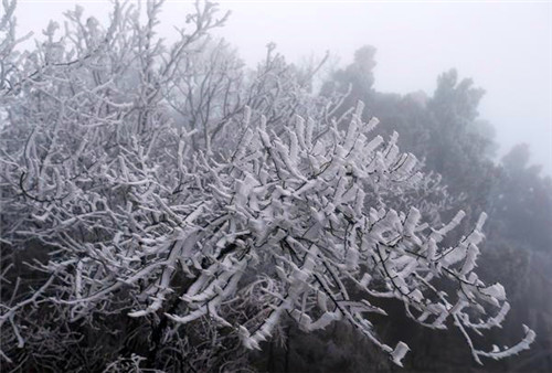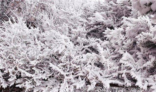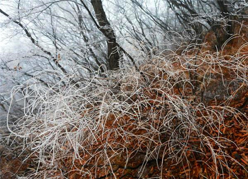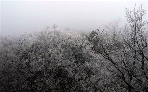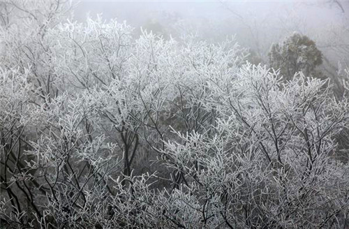 在云臺(tái)山茱萸峰等景點(diǎn),漫山遍野的林木草叢搖身一變,悄然穿上了白花花、晶瑩剔透的冰衣裳。遠(yuǎn)遠(yuǎn)望去,潔白晶瑩的霧凇,蓬松松、毛茸茸,伴著朦朧的云霧,整個(gè)霧凇山景構(gòu)成了一幅唯美浪漫的水墨畫(huà)卷,美得一塌糊涂。