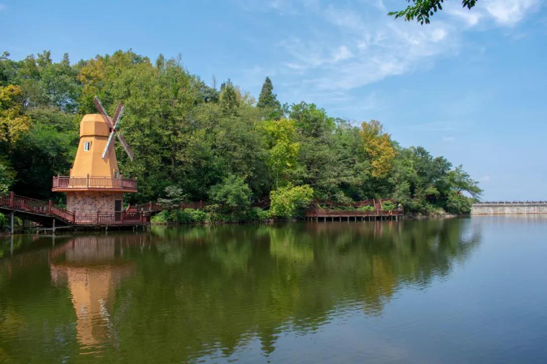 雞公山的精華景點(diǎn)都在山頂,所以到達(dá)目的地后乘坐景區(qū)巴士抵達(dá)了山頂?shù)膶殑ι娇。下車的第一個(gè)景點(diǎn),便是星湖了。因?yàn)閯傔^了盛夏的梅雨季,加之今年的雞公山雨量充沛,伴著來自山間的微風(fēng),星湖在陽光的照射下更加波光粼粼。在天氣晴朗的夜晚,滿天的星星把湖面當(dāng)成鏡子,爭(zhēng)著搶著看誰最亮。倒映在湖面上的藍(lán)天、白云、棧道、風(fēng)車、樹木猶如一個(gè)情竇初開的姑娘,自然之色就是她的妝發(fā),讓人有一眼萬年之感,不由的想起“目光所及之處皆是你”。