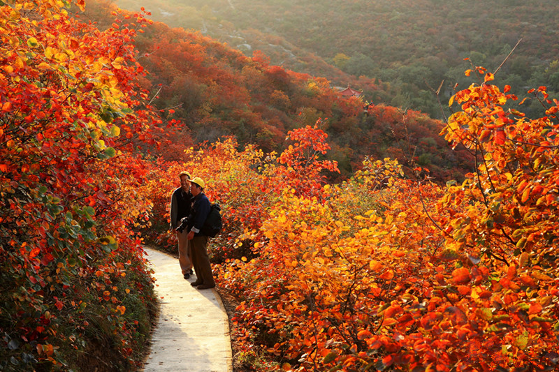秋色醉人,秋意正濃!環(huán)翠峪的紅葉以黃櫨為主,臥龍臺(tái)兩側(cè)的紅葉更是堪稱一絕。在景區(qū)沿蜿蜒的山路兩旁的紅葉,鮮紅的嬌艷欲滴,紫紅的流光溢彩,深紅的燦若晚霞。遠(yuǎn)望山麓,大片大片的紅葉林遮天蔽日,色彩斑斕,紅映藍(lán)天。忍不住寂寞的野菊花也被紅葉所感染,紅色、黃色、綠色構(gòu)成了一幅幅美麗的油畫。
