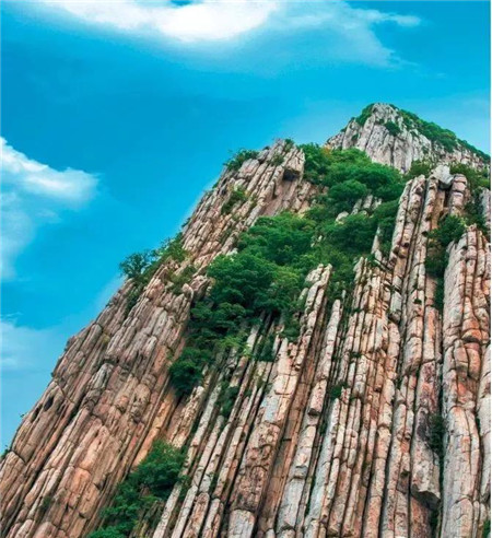 書冊巖:從不同的方位觀看,那一簇簇白色巖柱,在藍天白云的烘托下,或像一柄柄利劍直刺蒼穹,或像一冊冊圖書整齊排列。
