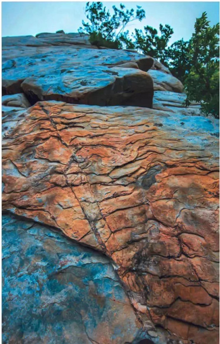 “節(jié)理”,由于巖石受力不均而出現(xiàn)的裂隙,但裂開面的兩側(cè)沒有發(fā)生明顯的位移,形態(tài)大多是由兩組構(gòu)成,如“X”型,是斷裂構(gòu)造的一類,精巧別致。