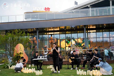 在市集區(qū),鮮花、美食、茶飲一應(yīng)俱全,還有流行歌手樂隊(duì)與萌寵樂園,當(dāng)夕陽(yáng)西下,整個(gè)市集被溫柔的燈光包圍,一場(chǎng)不期而遇的落日音樂會(huì)悄然上演。吉他弦動(dòng),歌聲悠揚(yáng),多重美好元素巧妙結(jié)合,讓人回歸自然本真。