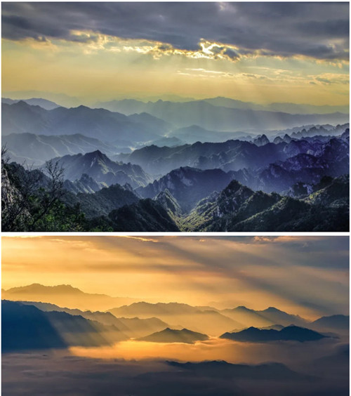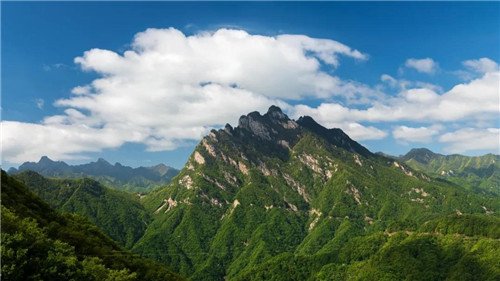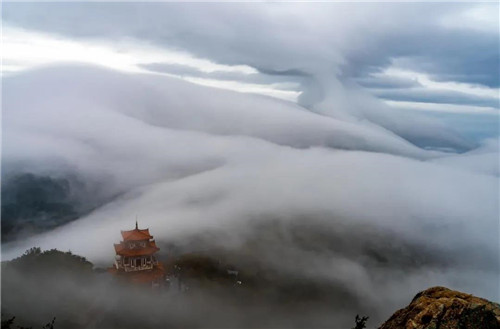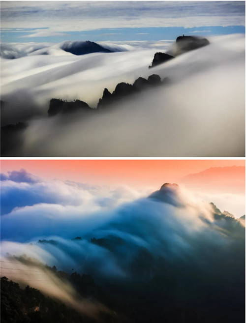 清風(fēng)過(guò)境,云朵漂移,微涼的秋風(fēng)緩緩地吹散云朵,抬頭看著它們一點(diǎn)點(diǎn)飄遠(yuǎn),不僅治好了頸椎病,心情也好了許多。云朵千變?nèi)f化,像海浪、像蘑菇、像綿羊、像魚(yú)鱗,目窮所及處,青峰千疊,白云四合。云卷云舒之間,人間仙境的自然魅力更加動(dòng)人心魄。