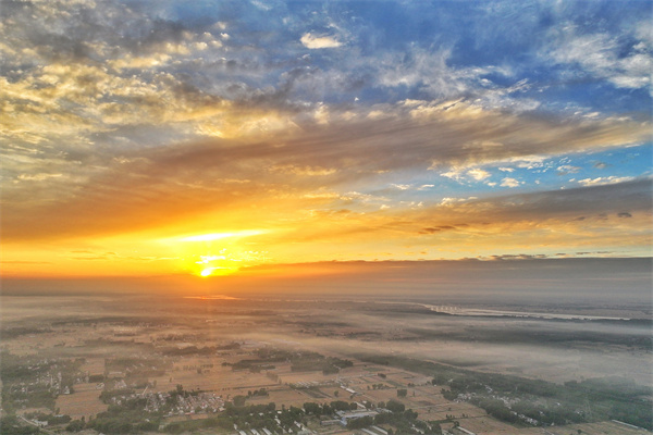 圖為太陽(yáng)緩緩爬上地平線,射出道道金光照耀萬(wàn)物。白文君 攝
