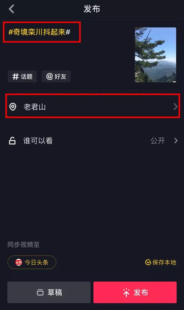 2、發(fā)布時加入#奇境欒川抖起來話題,抖音助推,想不成網(wǎng)紅都難;