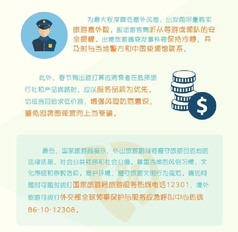 最后,國家旅游局提示,外出旅游期間要遵守旅游目的地的法律法規(guī)、社會公共秩序和社會公德。尊重當?shù)氐娘L俗習慣、文化傳統(tǒng)和宗教信仰。愛護環(huán)境,遵守旅游文明行為規(guī)范。遇到問題時可隨時撥打國家旅游局旅游服務熱線電話12301,境外旅游可撥打外交部全球領事保護與服務應急呼叫中心熱線86-10-12308。