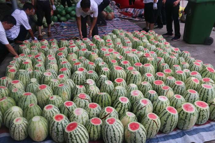 景區(qū)負責人說:一直以來,重渡溝所做活動都是以弘揚正能量,傳播真善美為出發(fā)點,從中國傳統(tǒng)文化的“仁”、“孝”中提煉,扶危助困,號召更多人關(guān)注弱勢群體,做一些力所能及的事。“扶危濟困助瓜農(nóng) 萬人吃西瓜大賽”活動一是幫扶貧困瓜農(nóng),響應政府旅游扶貧的號召。我們走訪各地尋找特困瓜農(nóng),在保障瓜品質(zhì)量的前提下,與特困瓜農(nóng)簽約,鼓勵他們種優(yōu)質(zhì)西瓜,做為景區(qū)固定西瓜供應商;二是想感謝一直默默奉獻在一線的環(huán)衛(wèi)工人,號召游客向環(huán)境美容師致敬。我們前期已將部分采購的愛心西瓜送給環(huán)衛(wèi)工人,今天特別邀請他們參與比賽,解暑同時放松自我,感受夏日的清涼與愛。