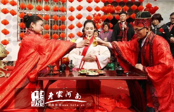 《禮記·昏義》:“婦至,婿揖婦以入,共牢而食,合巹而酳,所以合體、同尊卑,以親之也”。“同牢”指新婚夫婦共食一鼎所盛之肉。新人在婚禮上同席用餐,宣告從此在生活上合為一家、福壽同享。