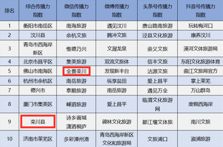 基于對縣級文化和旅游部門的微信、微博、頭條號和抖音號傳播力的綜合評價,2020年12月全國縣級文化和旅游新媒體綜合傳播力指數(shù)TOP10排序為:衡陽市南岳區(qū)、汶川縣、青島市西海岸新區(qū)、北京市昌平區(qū)、佛山市南海區(qū)、杭州市余杭區(qū)、德興市、廈門市集美區(qū)、欒川縣、濟南市萊蕪區(qū)。