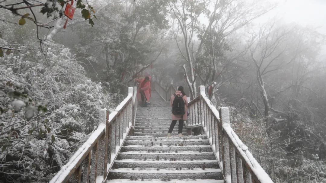 游客們紛紛踏雪而上
