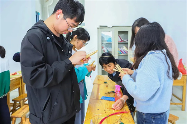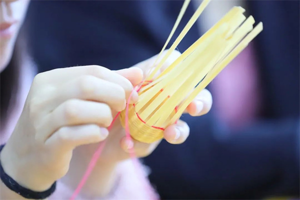 指導(dǎo)老師又對(duì)竹子的編制過程進(jìn)行講解和實(shí)操,讓學(xué)生更好地理解基本的編制方法:壓一挑一,挑一壓一?粗蠋熿`活翻轉(zhuǎn)的手指,同學(xué)們摩拳擦掌躍躍欲試。